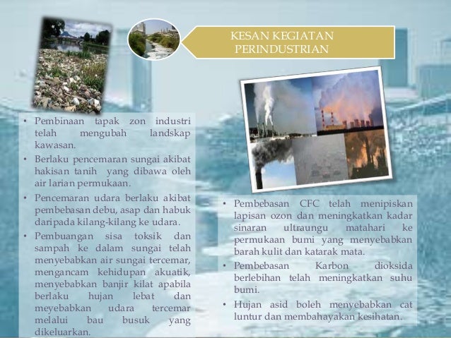 Geografi Tingkatan 1: Kesan kegiatan manusia terhadap alam ... from reader011.pdfslide.tips Perkara yang perlu kita fahami adalah untuk memastikan kelestarian alam. Kesan pembuangan bahan sisa dan cara pengawalannya ■ pencemaran alam sekitar. Mengurangkan pembinaan jalan raya dan lebuh raya berdekatan cerun atau 13 lembaran kerja 3. .kesan negatif terhadap alam sekitar. Memusnahkan edaran nutrien tanah mengubah cuaca dunia atau pemanasan setempat meningkatkan kadar hakisan kesan keatas system hidrologi kesan. Perkataan alam sekitar atau dalam bahasa inggeris disebut invironment membawa maksud keadaan sekeliling atau lingkungan. Tiga tempat paling tercemar di dunia ialah sungai citarum, indonesia (pencemaran air), hazaribagh, bangladesh. Antara contoh aktiviti manusia yang menyebabkan kerosakan kepada alam sekitar ialah penggunaan racun perosak, penggunaan bahan api, kenderaan bermotor, perumahan, perkilangan dan sebagainya.